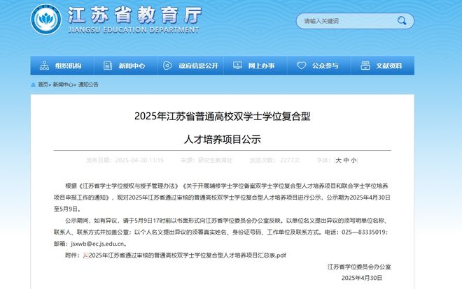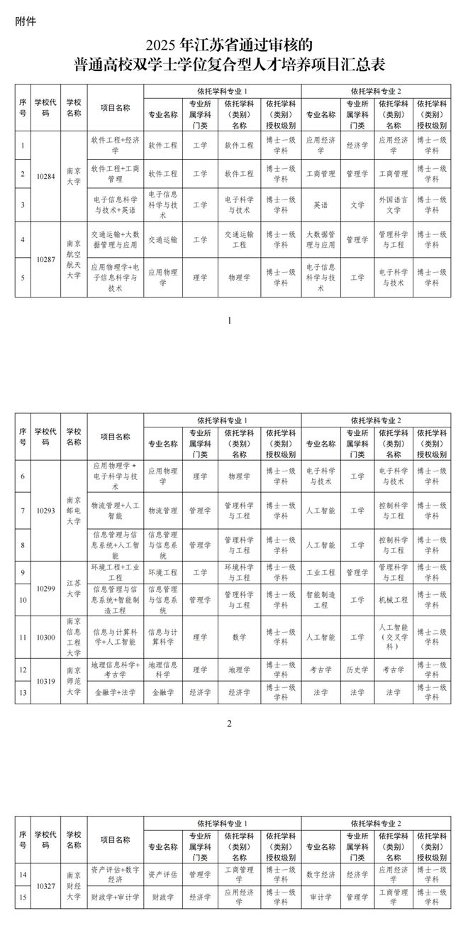 近日,江苏省教育厅发布2025年江苏省普通高校双学士学位复合型人才培养项目公示,